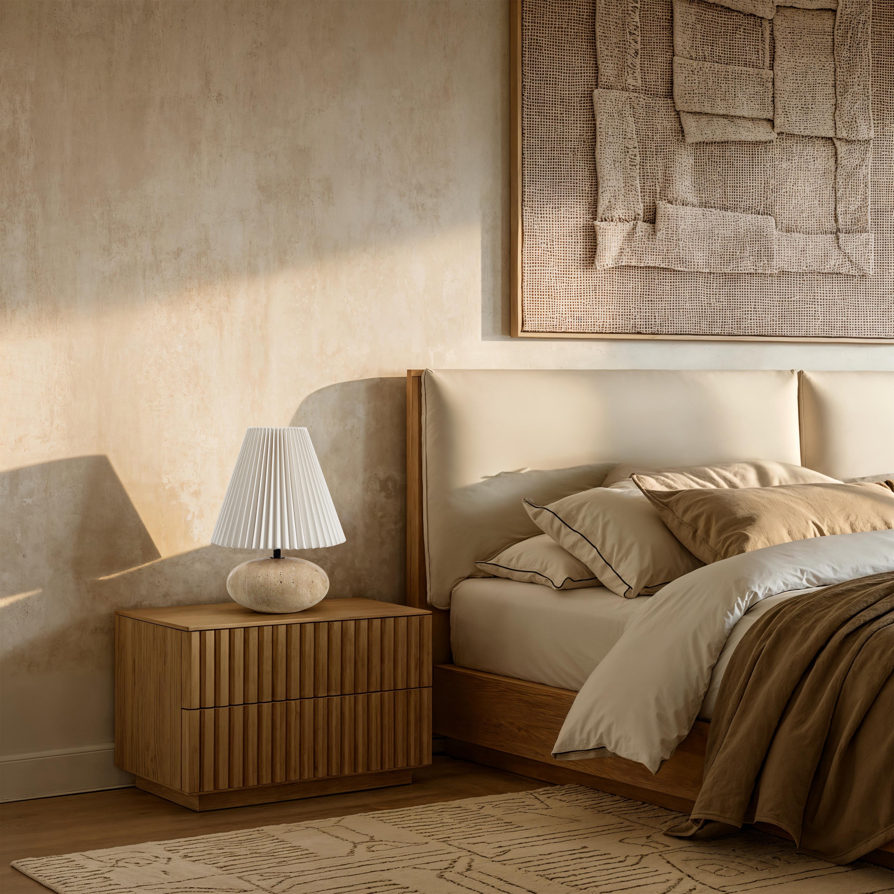 Inspirée par le designer et styliste d'intérieur canadien Arren Williams, cette petite lampe au design affirmé est idéale pour les espaces en quête d'un éclairage élégant. Mesurant 25 cm de large sur 35 cm de haut, elle offre des proportions parfaites pour un impact visuel maximal malgré son format compact. Son socle en travertin et son abat-jour conique plissé couleur crème s'intègrent harmonieusement aux intérieurs neutres contemporains.
